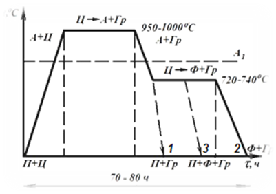 Такая термическая обработка состоит из медленного нагрева в течение 20-25 ч до температуры 900-1050 °С, длительной выдержки в течение 10-15 ч и медленного охлаждения. Эта операция в общей сложности продолжается примерно 70-80 ч. При непрерывном охлаждении до комнатной температуры получают ковкий чугун на перлитной основе (рис. 2.8, режим 1). При выдержке в районе температур 720-740 °С в течение 25-30 ч получают ковкий чугун на ферритной основе (рис. 2.8, режим 2). В резуль тате выдержки цементит в перлите разлагается (Fe3С = 3Fe + C) и углерод выделяется в хлопьевидной форме. При недостаточном времени выдержки чугун будет иметь феррито-перлитную основу (рис. 2.8, режим 3). Ковкий чугун обычно имеет следующий химический состав: 2, 4-2, 8 % C; 0, 8-1, 4 % Si; Mn £ 1, 0 %. Низкое содержание углерода даёт небольшое количество графитных включений, что улучшает механические характеристики чугуна.