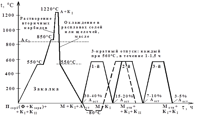 Высокая температура нагрева под закалку необходима для того, чтобы растворить наибольшее количество карбидов и получить высоколегированный аустенит, а затем при закалке мартенсит, высоколегированный хромом, вольфрамом, молибденом и ванадием. В этом случае сталь сохраняет высокую твёрдость (красностойкость); распад мартенсита происходит при более высоких температурах. После нагрева мелкий инструмент простой формы закаливают в масле. Хорошие результаты (в смысле уменьшения закалочных деформаций) даёт ступенчатая закалка в расплавах солей и щелочей. В структуре закалённой быстрорежущей стали остается около 30-40 % аустенита. Для более полного превращения остаточного аустенита в мартенсит инструмент подвергают многократному отпуску при 560 °С.