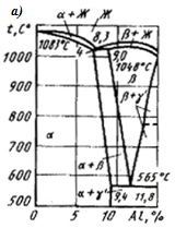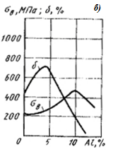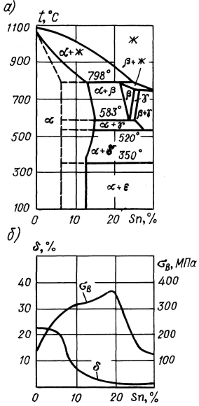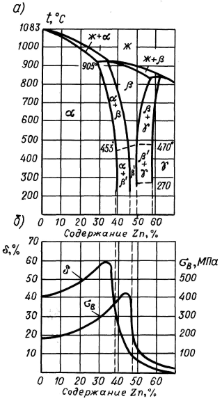 Твердый раствор Zn (и других легирующих элементов) в Cu (a) обладает высокой пластичностью, фаза b‑ интерметаллическое соединение CuZn - повышенной твердостью и хрупкостью. Соответственно характерным свойством a‑ латуней (содержание Zn до 39%) является исключительно высокая пластичность (относительное удлинение d достигает 65%); (a+b)-латуни (39< Zn< 45%) более прочны и тверды, но менее пластичны. Однофазные латуни с b-структурой (Zn> 45 %) имеют низкий комплекс механических свойств и практического применения не получили.