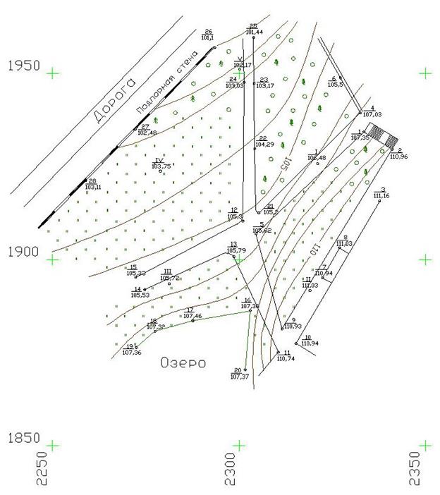 Рис 11. Получение исходных данных для проектирования горизонтальной площадки (отметки найдены применительно к одному из вариантов студенческой работы)