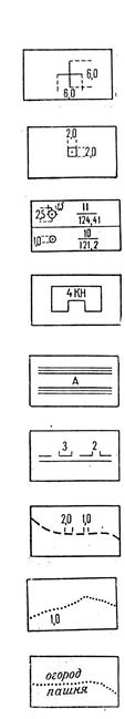 Шоссе (вычерчивается по заданным размерам в масштабе плана; кюветы — четыре крайние линии зеленой тушью; на проезжей части указывается материал покрытия: А — асфальт, Б—булыжник) Грунтовая дорога (вычерчивается по заданным размерам в масштабе плана) Тропа Границы угодий Огород, пашня (шрифт — курсив, высота 2 мм)