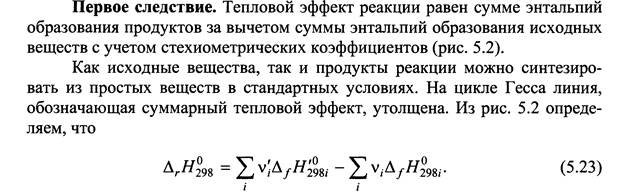 Закон открыт русским химиком Г. И. Гессом в 1840 г.; он является частным случаем первого начала термодинамики применительно к химическим реакциям. Практическое значение закона Гесса состоит в том, что он позволяет рассчитывать тепловые эффекты разнообразных химических процессов; для этого обычно используют ряд следствий из него: 1. Тепловой эффект прямой реакции равен по величине и противоположен по знаку тепловому эффекту обратной реакции (закон Лавуазье — Лапласа). 2.Тепловой эффект химической реакции равен разности сумм теплот образования (Δ Hf) продуктов реакции и исходных веществ, умноженных на стехиометрические коэффициенты (ν):