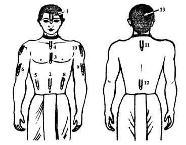 Тилака наносится на 12 частей тела — лоб, пупок, сердце, горло, обе стороны живота, руки, плечи, заднюю часть шеи и поясницу. Нанесение тилаки на эти места и перечисление имен Вишну очищает и посвящает тело к служению Господу. Она не должна быть кривой, нечёткой, неровной, грязной. На лбу центральная часть между двумя вертикальными линиями должна идти от линии бровей к линии волос, но соединяться внизу. Иметь тилаку очень важно как для очищения, так и для защиты. Более того, она является замечательным украшением вайшнава. Видя тилаку, окружающие понимают, что перед ними — преданный Вишну. Когда люди видят преданных с тилакой, они вспоминают о Кришне и очищаются.
