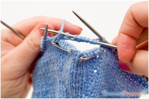 Клин для большого пальца перчатки Если вы хотите, чтобы по краям клина образовались ажурные отделочные отверстия, вам нужно провязывать накиды с ажуром. Теперь переснимем петли клина на две булавки: по 6 и 7 петель. Над ними набираем 6 воздушных петель: столько же, сколько находится на одной булавке (лучше набрать четное число).