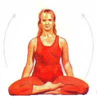 Вертикальное растяжение мышц I (1) Для того чтобы сесть в позу Полу-лотоса, согните правое колено и поместите правую ступню на левое бедро. Затем согните левое колено и поместите левую ступню под правое бедро. Или сядьте в любую другую удобную позу, выпрямив шею и спину, и расправив плечи, но без напряжения. Руки опустите вдоль туловища по обеим сторонам тела. Расслабьте плечи и руки, медленно ими вращая.