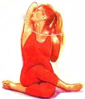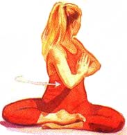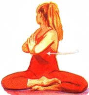 Диагональное растяжение мышц II (1) Сядьте в любую удобную позу, скрестив ноги. Можете попытаться сделать Гомукхасану. Согните левую ногу в колене и поместите левую пятку снаружи от правого бедра. Затем перекиньте правую ногу через левое бедро. Постарайтесь расположить ноги так, чтобы оба колена находились на одной прямой вертикальной линии; после чего поместите правую пятку снаружи от левого бедра. Заведите руки за спину, подняв правый локоть и опустив левый. Постарайтесь соединить пальцы обеих рук за спиной (и при возможности переплести их).