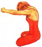 Горизонтальное растяжение мышц III (1) Следующее упражнение выполняется трижды. Переведите руки вперед на уровне плеч, пальцы сцеплены. Подбородок прижмите к груди, чтобы хорошо растянуть мышцы шеи. На вдохе вытяните руки вперед и задержите дыхание на 5 секунд.