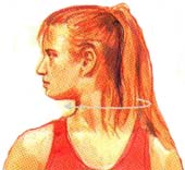 Растяжение мышц шеи I (2) На выдохе наклоните голову вперед (не сгибая туловище) до тех пор, пока подбородок не коснётся груди. Плечи остаются расслабленными. Повторите упражнение 2-3 раза. Затем на вдохе поднимите голову, выдохните и расслабьтесь.