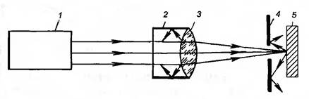 Рис. 4.37. Схема экранирования отраженного излучения лазера блендами и диафрагмами: 1— лазер; 2— бленда; 3— линза; 4— диафрагма; 5 — мишень На открытых площадках обозначаются опасные зоны и устанавливаются экраны, предотвращающие распространение излучений за пределы зон. Экраны могут быть непрозрачными и прозрачными. Непрозрачные экраны изготовляются из металлических листов (стали, дюралюминия и др.), гитенакса, пластика, текстолита, пластмасс. Прозрачные экраны из специальных стекол светофильтров или неорганического стекла со спектральной характеристикой, соответствующей длине волны излучения лазера. Приведение лазера в рабочее состояние обычно блокируется с установкой защитного устройства. Генератор и лампы накачки лазера заключаются в светонепроницаемую камеру. Лампы накачки должны иметь блокировку, исключающую вспышку лампы при открытом положении камеры. Для основного луча каждого лазера выбирается направление и зона, в которых исключается пребывание людей. Работы с лазерными установками проводятся в отдельных помещениях или специально отгороженных частях помещения. Само помещение изнутри, оборудование и другие предметы не должны иметь зеркально отражающих поверхностей, если на них может падать прямой или отраженный луч лазера. Эти поверхности окрашиваются в матовые цвета. Для мишени рекомендуется темная окраска. В помещении должна быть создана хорошая освещенность. Коэффициент естественной освещенности (КЕО) должен быть не менее 1, 5 %, а общее искусственное освещение не менее 150 лк (см. гл. 2, разд. V). При эксплуатации импульсных лазеров с высокой энергией излучения должно применяться дистанционное управление. Лазеры IV класса опасности обязательно располагаются в отдельном помещении и снабжаются дистанционным управлением. Присутствие в помещении людей при работе такого лазера не допускается. Средства индивидуальной защиты применяются при недостаточности для защиты средств коллективной защиты. К СИЗ относятся технологические халаты, перчатки (для защиты кожных покровов), специальные очки, маски, щитки (для защиты глаз). Халаты изготовляют из хлопчатобумажной ткани белого, светло-зеленого или голубого цвета. Очки снабжены оранжевыми, сине-зелеными и бесцветными стеклами специальных марок, обеспечивающими защиту от лазерного излучения определенных диапазонов длин волн. Поэтому выбор очков должен соответствовать длине волны лазерного излучения.