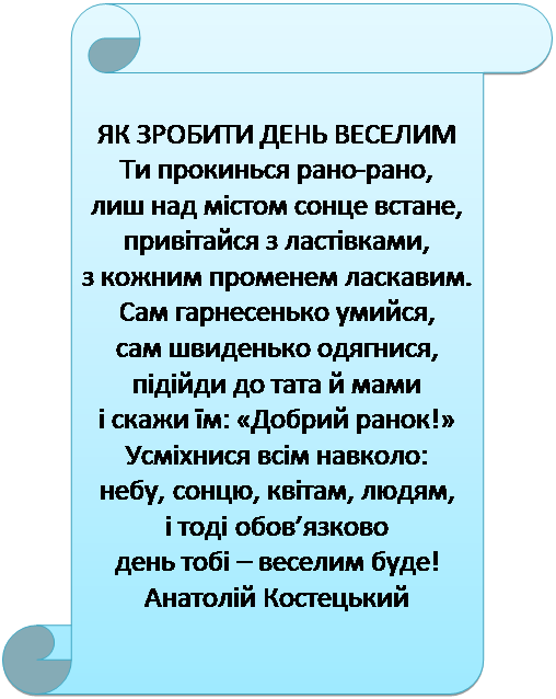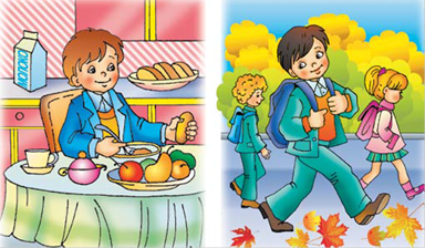 Режи дня 7.00 — підйом. Ранкова зарядка. 7.15 — умивання та водні процедури. 7.20 — сніданок. Дорога до школи. 8.00— 10.25 — заняття у школі, закінчення трьох уроків. 10.25 — 11.25 — велика перерва, прийом гарячої їжі, відпочинок на свіжому повітрі. 11.25 — 13.00 — продовження занять у школі. 13.00 — 13.30 — обід. 13.30 — 14.30 — сон для учнів перших класів та для дітей з ослабленим здоров’ям. 14.30— 15.30 — відпочинок на свіжому повітрі: прогулянки, ігри. 15.30 — 17.00 — виконання домашнього завдання, читання книг, відвідування гуртків. 17.00 — підвечірок. 17.30 — 19.00 — прогулянка, ігри на свіжому повітрі. вечеря. 19.30 — 21.00 — читання художньої літератури, домашні ігри, перегляд дитячих телепередач. 21.00 — водні процедури, сон.