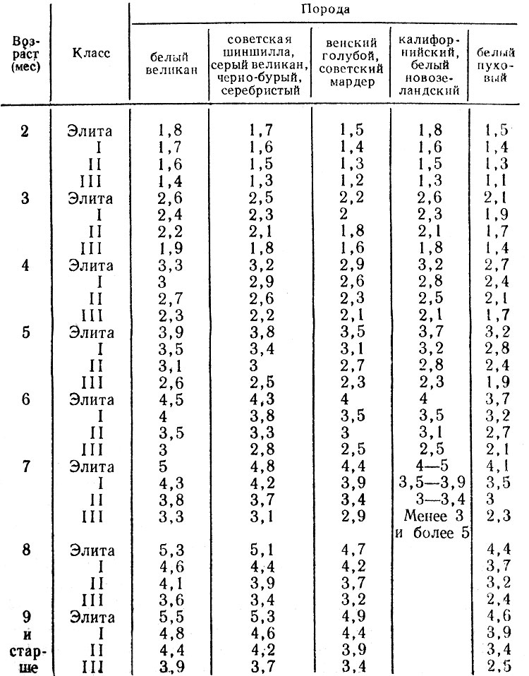 Оценку кроликов разных пород по живой массе проводят в соответствии с требованиями, представленными в табл. 7. Телосложение оценивают путем осмотра по степени развития костяка, ширине и глубине груди, форме и размеру головы, форме и линии спины, крепости и постановке конечностей. При осмотре обращают внимание на наличие пороков и дефектов телосложения. К порокам относят: слабый и плохо развитый костяк, слабо развитую грудь, горбатую или провислую спину, обрубленный или свислый круп, шилозадость, очень тонкие, искривленные или неправильно поставленные по отношению к туловищу конечности, а к дефектам телосложения - неправильной формы голову, излишне длинную шею, свислые или широко поставленные уши, отвислый живот, а у кроликов мясного направления продуктивности - еще и недостаточную округлость и ширину крупа. Кроликов, имеющих хотя бы один порок телосложения, выбраковывают и к племенному использованию не допускают. Кроликов, у которых обнаружено два и более дефектов в телосложении, оценивают по этому признаку третьим классом. При наличии одного дефекта кролика относят ко второму классу. К элите и первому классу относят кроликов, у которых идеальное телосложение без каких-либо пороков и дефектов. Густоту волосяного покрова определяют у кроликов меховых пород по величине дна розетки, которую получают, раздувая мех против направления роста волос на середине хребта, а уравненность - путем сопоставления величины розетки на крупе, хребте и боках. Оценивается также густота и упругость волоса на нижней поверхности задних лап. У кроликов класса элита при раздувании волосяного покрова на любых из указанных выше участках поверхность кожи почти не обнаруживается. У таких кроликов волосяной покров густой, с упругой остью и очень густой подпушью. На нижней стороне задних лап также имеется Густой упругий волос. У кроликов I класса при раздувании волосяного покрова допускается появление оголенной кожи на дне розетки площадью до 2 мм2. На лапах густой упругий волос. У кроликов II класса допускается неуравненная густота опушения: более густая подпушь на огузке и менее густая на хребте и боках. При раздувании волосяного покрова на дне розетки обнаруживается поверхность кожи площадью от 2 до 4 мм2. На лапах более редкий и мягкий волос. У кроликов III класса волосяной покров неуравненный по густоте и более редкий. На дне розетки обнаруживается поверхность кожи площадью от 4 до 6 мм2. На лапах редкий, мягкий волос, имеются признаки потертости опушения лап. Окраску волосяного покрова определяют глазомерно при хорошей освещенности рассеянным светом только у меховых пород кроликов мясо-шкуркового направления продуктивности. В соответствии с породными особенностями кроликов по этому признаку оценивают поразному. Так, при оценке кроликов породы белый великан по окраске волосяного покрова учитывается в основном только его блеск. Класс элита по этому признаку получают кролики с волосяным покровом чисто белого цвета с хорошим блеском. Незначительное ослабление блеска волосяного покрова соответствует I классу, а слабый блеск - II классу. III классом оценивают кроликов с волосяным покровом с матовым оттенком. Наиболее сложный окрас волосяного покрова у кроликов породы серый великан и шиншилла. К классу элита породы серый великан относят животных, у к