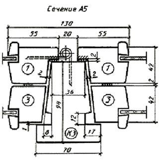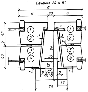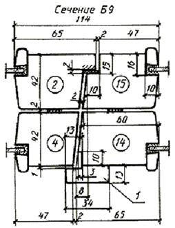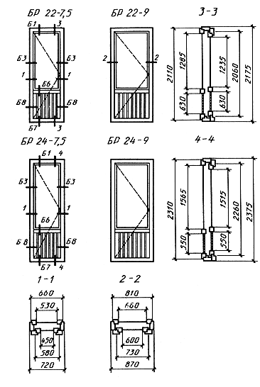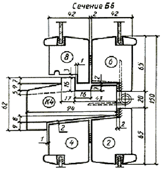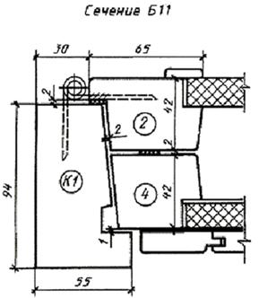 Примечания: 1. К1 – профили сечения коробок; 1 (в круге) – профили сечения створок. 2. Ширину верхнего выступа нижнего бруска коробки допускается уменьшать на 2 мм. 3. Толщину нижнего бруска коробки допускается увеличивать на 3 мм с соответствующим увеличением высоты коробки.