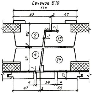 Черт. 19 1 - мягкая древесноволокнистая плита толщиной 12 мм ГОСТ 4598-74; 2 - твердая древесноволокнистая плита марки Т группы А толщиной 3, 2 -4 мм по ГОСТ 4598-74; 3 - шлифованная древесноволокнистая плита толщиной 16 мм по ГОСТ 10632-77; 4 - пергамин по ГОСТ 2697-83; 5 - обшивка типа О-2 по ГОСТ 8242-75; 6 - раскладка; 7 - уплотняющая прокладка