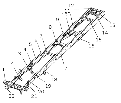 Малюнок 4 - Рама автомобіля КамАЗ. Рама автомобіля: 1 - поперечина № 1; 2 - кронштейн передньої опори силового агрегату; 3-поперечина № 2, 4 - кронштейн задньої опори двигуна; 5 - лонжерон правий; 6 - кронштейн балки підтримуючої опори силового агрегату; 7 - поперечина № 3; 8 - поперечина № 4; 9 - косинка нижня поперечки № 5; 10 - косинка верхня поперечки № 5; 11-поперечина № 5; 12 - поперечина задня, 13 - Розкіс задній поперечки; 14 - поперечина № 7; 15 - поперечина № 6; 16 - прокладка кронштейна балансирной підвіски, 17 - лонжерон лівий; 18 - задній кронштейн передньої підвіски; 19 - кронштейн амортизатора; 20 - кронштейн опори радіатора; 21-кронштейн передній передньої підвіски, 22 - кронштейн буфера Опори ресори і нижні реактивні важелі для полегшення ремонту виконані знімними. Опори зафіксовані від переміщення установочними пластинами. Для обмеження ходу мостів вниз на опорах ресор встановлені обмежувачі хитання мостів. Автомобілі КамАЗ різних моделей і комплектацій мають рами розрізняються: довжиною в залежності від бази; кількістю і конструкцією поперечок; підсилювальними накладками та їх конструкцією; кронштейнами і їх становищем. Технічне обслуговування Планово-попереджувальна система технічного обслуговування автомобілів побудована так, що при виконанні кожного наступного виду технічного обслуговування повторюють більшість операцій попередніх обслуговувань. Для чіткого виконання всі операції технічних обслуговувань розподіляють за видами робіт: збирально-мийні, оглядові, кріпильні, контрольні, регулювальні, заправочно-мастильні, шиномонтажні. Операції технічного обслуговування пов'язані з ходовою частиною здійснюються тільки при ЩО, ТО - 1 і ТО - 2.
