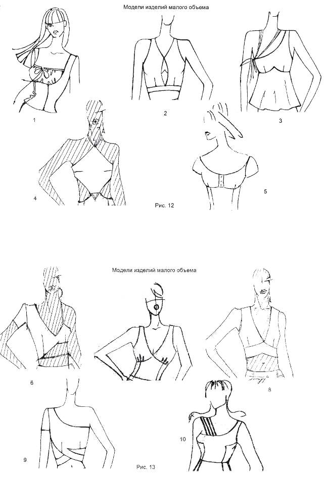 В лабораторной работе студенты индивидуально должны выполнить разработку чертежей конструкций двух изделий малого объема по эскизам моделей, изображенных на рис. 10-13. Номер модели для проработки соответствует последней цифре шифра студента (зачетной книжки). В дальнейшем конструкция одного из изделий должна быть проверена в макете и отработана. 2. В соответствии с эскизом модели определяют участки изделия, на которых необходимо добиться плотного прилегания к фигуре.Производят дополнительные измерения конкретной фигуры, пользуясь двумя гибкими линейками (см.рис.8). Количество измерений соответствует количеству участков конструкции, подлежащих корректировке. Величины измерений записывают в табл. 7. Таблица 7 Размерные признаки фигуры