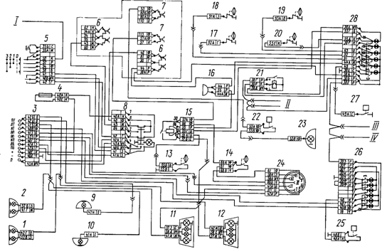 Рис. 324. Электрическая схема системы световой сигнализации: 1, 2 - фонари передние левый и правый; 3 - реле-прерыватель указателей поворота и аварийной сигнализации; 4 - предохранитель плавкий ПР 119 (6 А); 5 - переключатель света комбинированный; 6 - предохранитель 13.3722 (7, 5 А); 7 - предохранитель ПР 310 (10 А); 8 - выключатель аварийной световой сигнализации; 9, 10 - указатели поворота правый и левый; 11, 12 - фонари задние левый и правый; 13 -выключатель сигналов торможения; 14 - выключатель электромагнитного клапана прицепа; 15 - реле сигналов торможения; 16 - сигнал звуковой (зуммер); 17, 18, 19 - выключатели сигнализаторов падения давления в ресиверах пневмопривода тормозных механизмов; 20 - выключатель сигнализатора стояночной тормозной системы; 21 - реле-прерыватель сигнализатора включения стояночной тормозной системы; 22 - выключатель света заднего хода; 23 - фонарь заднего хода; 24 - розетка прицепа 24 В; 25 - выключатель сигнализатора блокировки межосевого дифференциала; 26, 28 -блоки сигнализаторов; 27 - выключатель сигнализатора засоренности масляного фильтра; I - к выключателю приборов и стартера; II - к указателю температуры охлаждающей жидкости; III - к указателю тахометра; IV - к указателю спидометра