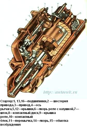 Стартер представляет собой герметичный электродвигатель постоянного тока последовательного возбуждения с электромагнитным тяговым реле и приводом с храповым механизмом свободного хода. Включение стартера дистанционное. Шестерня привода входит в зацепление с венцом маховика принудительно с помощью электромагнитного тягового реле. Стартер выполнен для работы в однопроводной схеме, где вторым проводом служит масса двигателя.
