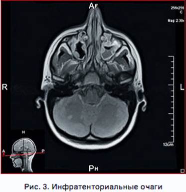 · инфратенториальные очаги (расположены ниже намета мозжечка) – часто локализуются в ножках мозжечка; очаги в мосту нередко прилежат к четвертому желудочку; к ним приравниваются очаги в спинном мозге;