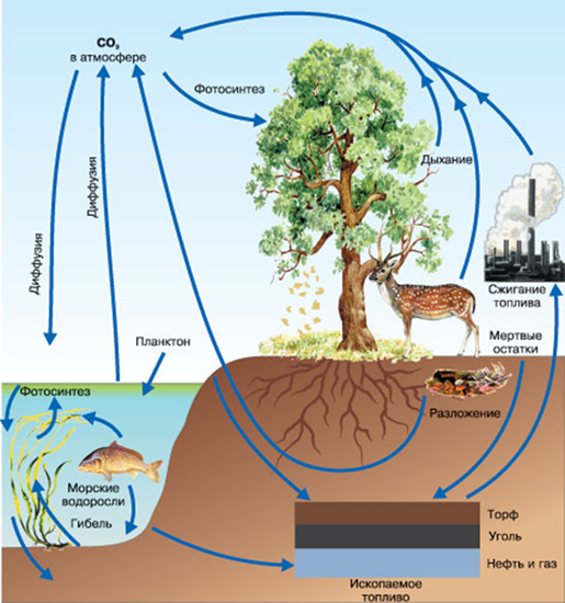 Самый интенсивный биогеохимический цикл – круговорот углерода. В природе углерод существует в двух основных формах – в карбонатах (известняках) и углекислом газе. Содержание последнего в 50 раз больше, чем в атмосфере. Углерод участвует в образовании углеводов, жиров, белков и нуклеиновых кислот. Основная масса аккумулирована в карбонатах на дне океана (1016 т), в кристаллических породах (1016 т), каменном угле и нефти (1016 т) и участвует в большом цикле круговорота. Основное звено большого круговорота углерода – взаимосвязь процессов фотосинтеза и аэробного дыхания. Другое звено большого цикла круговорота углерода представляет собой анаэробное дыхание (без доступа кислорода); различные виды анаэробных бактерий преобразуют органические соединения в метан и другие вещества (например, в болотных экосистемах, на свалках отходов). В малом цикле круговорота участвует углерод, содержащийся в растительных тканях (около 1011 т) и тканях животных (около 109 т).
