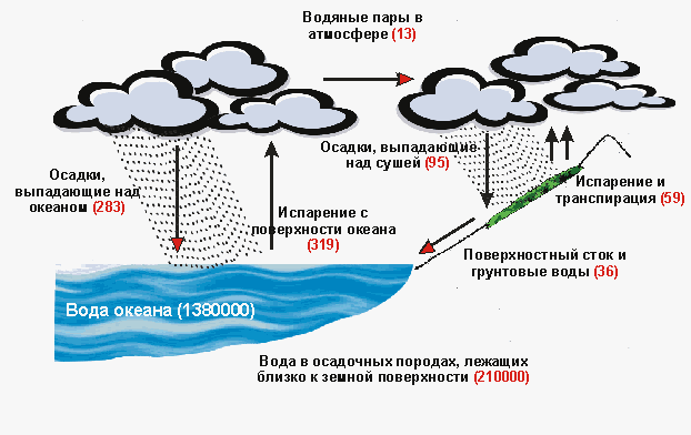 Вода в трёх агрегатных состояниях присутствует во всех составных частях биосферы: атмосфере, гидросфере и литосфере. Если воду, находящуюся в различных гидрогеологических формах, равномерно распределить по соответствующим областям земного шара, то образуются слои следующей толщины: для Мирового океана 2700 м, для ледников 100 м, для подземных вод 15 м, для поверхностных пресных вод 0, 4 м, для атмосферной влаги 0, 03 м. Основную роль в циркуляции и биогеохимическом круговороте воды играет атмосферная влага, несмотря на относительно малую толщину её слоя. Атмосферная влага распределена по Земле неравномерно, что обуславливает большие различия в количестве осадков в разных районах биосферы. Среднее содержание водяного пара в атмосфере изменяется в зависимости от географической широты. Например, на Северном полюсе оно равно 2, 5 мм (в столбе воздуха с поперечным сечением 1 см2), на экваторе - 45 мм. О механизме гидрогеологического цикла было сказано выше – в разделе касающемся описания особенностей гидросферы. Вода, выпавшая на сушу, затем расходуется на просачивание (или инфильтрацию), испарение и сток. Просачивание особенно важно для наземных экосистем, так как способствует снабжению почвы водой. В процессе инфильтрации вода поступает в водоносные горизонты и подземные реки. Испарение с поверхности почвы также играет важную роль в водном режиме местности, но более значительное количество воды выделяют сами растения своей листвой. Причём количество воды, выделяемое растениями, тем больше, чем лучше они ею снабжаются. Растения, производящие одну тонну растительной массы, поглощают как минимум 100 т воды. Главную роль в круговороте воды на континентах играет суммарное испарение (деревья и почва). Последняя составляющая круговорота воды на суше – сток. Поверхностный сток и ресурсы подземных водоносных слоёв обеспечивают питание водных потоков. Вместе с тем при уменьшении плотности растительного покрова сток становится основной причиной эрозии почвы. Как уже отмечалось, вода участвует и в биологическом цикле, являясь источником кислорода и водорода. Однако фотолиз её при фотосинтезе не играет существенной роли в процессе круговорота.