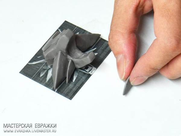 13. Раскатываем пласт ок. 1 мм толщиной, обратную сторону кулона смазываем гелем, кладем на пласт и вырезаем по контуру.