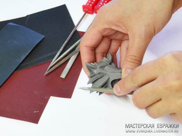 10. Шлифуем. Сначала грубо надфилем (не оставляйте глубоких борозд!) основную форму, потом наждачкой №600 - 800. Полировать не нужно, краска лучше ляжет на шероховатую поверхность.