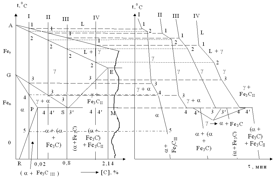 Фрагмент диаграммы состояния железо-цементит (2, 14 - 6, 67 % С) с соответствующими кривыми охлаждения