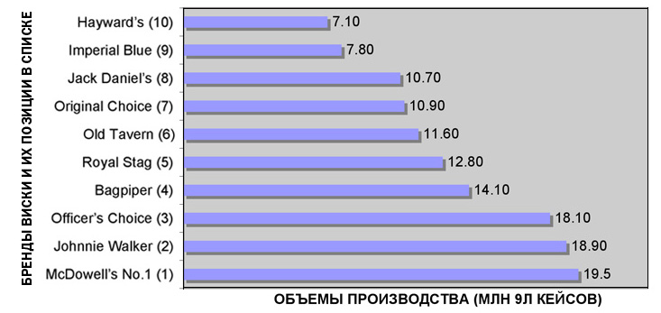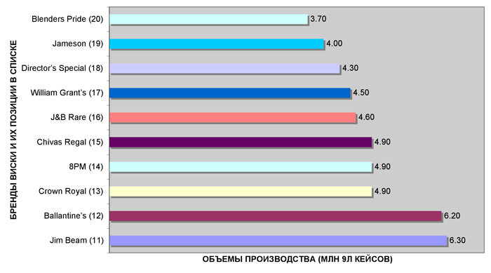 Далее, в порядке убывания годового выпуска, места в списке заняли: шотландский Dewar’s (3, 0); индийский Director’s Special Black (2, 9); продолжающий развиваться японский Suntory Kakubin (2, 8); хорошо знакомые россиянам шотландские купажи William Lawson’s (2, 6) и Label 5 (2, 5) и только появившийся на отечественном рынке William Peel (2, 5), а также шотландский Bell’s (2, 5).