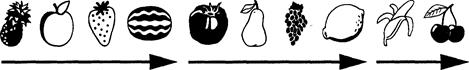 Этап 4. Этот этап посвящен формированию в первую очередь числовых порядковых, временных и через них — иных квазипространственных и собственно лингвистических представлений. Таким образом, именно на этом этапе формируется общность представлений о количественных пространственно-временных понятиях и их соотношениях. Одновременно происходит закрепление материала предыдущих этапов. На подэтапе 4А чрезвычайно важной является возможность закрепления числового ряда (или овладения им) через последовательное изображение тех или иных объектов в определенном направлении (слева-направо). Например: первым (в крайней левой позиции) изображается яблоко, вторым — груша, третьим — банан, и так до десяти изображений. После чего стрелкой (вектором) слева-направо анализируется направление, в котором рисовались предметы. Далее определяется то, что было нарисовано «ДО» какого-либо из изображений и, соответственно, «ПОСЛЕ» него (рис 4.2).