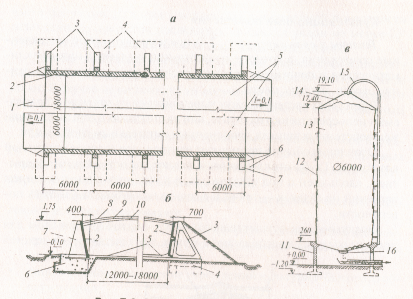 Рис. 84.Поперечные разрезы зернохранилищ: а _ напольных; б — закромных; в — бункерных; 1 — фундамент; 2 — колонна; 3 — подпорные инвентарные щиты; 4 — стеновая панель; 5 _ прогоны покрытия; 6 — плиты покрытия с кровлей; 7 — бурт зерна; 8 — наружная несущая стена; 9 — стропила; 10 — покрытиеиз асбестоцементных листов; 11 — верхняя транспортерная галерея; 12 — закром для зерна; 13 — кольцевые элементы бункера; 14 — надбункернаягалерея; 15 — деревянный настил; 16 — металлические воронки; 17 — стены из асбестоцементных листов; 18 — надбункерное помещение
