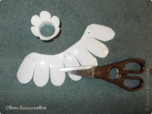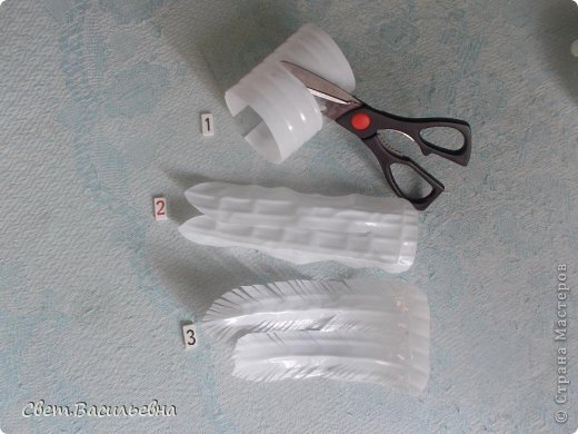 67. Готовим перья для корпуса. Из боковины бутылки выбрасываем часть, на которой есть остатки клея. Благо, на таких бутылках он нанесён не очень широкой полоской. Я в принципе не знаю, чем этот клей удаляется, да и не считаю нужным. Но если не убрать эту полоску, на неё налипнет грязь, и будет наш лебедь местами замарашкой.