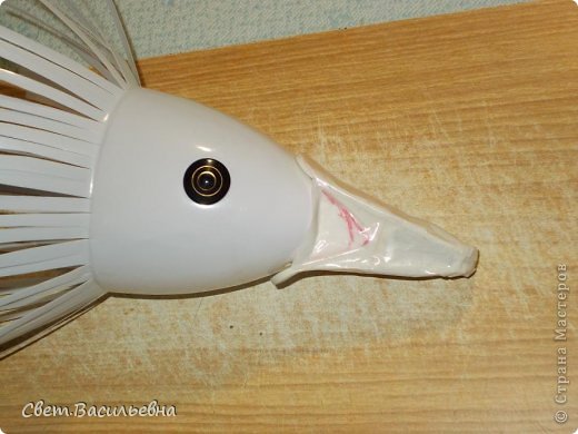 15. Прокалываем по паре отверстий вверху и внизу будущего клюва. Если предпочитаете ниткам клей, то можно не делать отверстия, здесь это не принципиально, но у меня есть сомнения: будет ли прочно держаться клей на очень гладкой поверхности бутылки. Впрочем, выбор за вами...