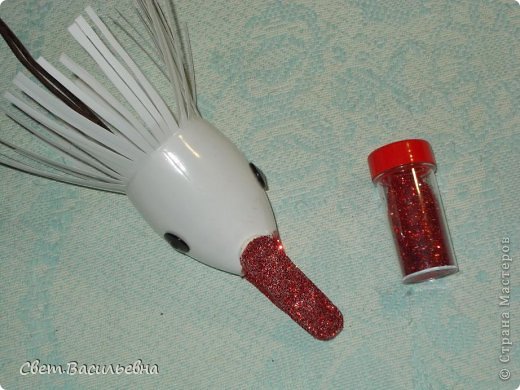 34. Насыпаем блёстки на бумагу и хорошенько обваливаем в них клюв со всех сторон. Прижимаем пальцами, заполняем пробелы, если есть. Стряхиваем лишнее на бумагу. Оставшиеся блёстки удобно ссыпать обратно, если лист бумаги был предварительно согнут. Проверяем пальцами прочность покрытия. Сыпаться не должно. (И не будет, если скотч нормальный).