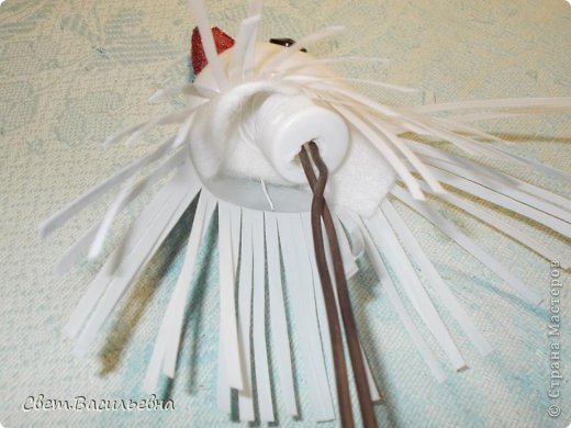 40. Вот так должно получиться: леска должна оказаться затянутой там, где на горлышке бывшей бутылки резьба переходит в конус. Леска довольно скользкая, может легко развязаться, поэтому сделаем 2 - 3 узла. Узел желательно расположить сверху, так сказать, ближе к " затылку", а не под " подбородком". И концы лески пока не отрезаем, за них потом будем пришивать корону. Добавляем ещё элементы шеи. Уже вырисовывается что-то...