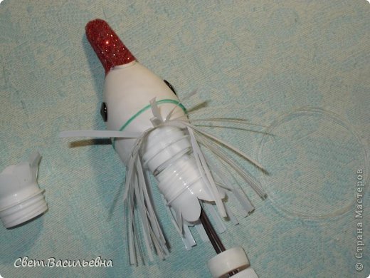 10. Чтобы не очень надоели предыдущие операции, можем заняться головой. Отрезаем пробку полулитровой бутылочки любым удобным для вас способом. Впрочем, если в итоге выберете клюв НЕ из прищепки, то отрезать не надо. Как сделать первый вариант клюва (из колпачка от маркера), я покажу в ближайшее время в отдельном МК, а то здесь и так много фоток. Можно будет найти в моём блоге.