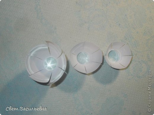 44. Готовые элементы. Только в самом большом надо слегка укоротить пять лепестков. К сожалению, на фото очень плохо видны намеченные линии: так и не смогла выбрать оптимальные условия съёмки, и фон меняла, и подсветку, всё равно качество неважное. Пластмасса " бликует", то слишком светло, то наоборот. А вообще, уместно, пожалуй, вспомнить про плохого танцора (прошу прощения). Итак, корректируем лепестки, может следующее фото внесёт ясность.
