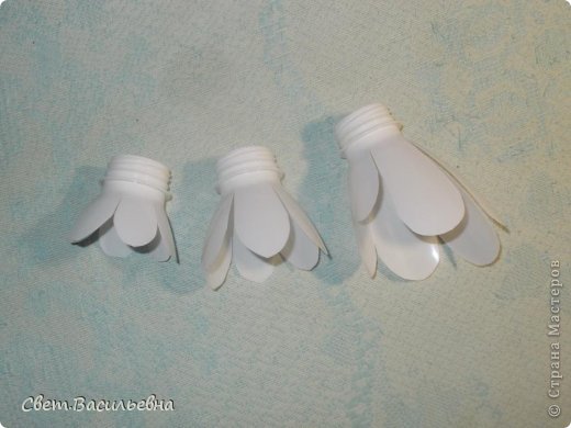 37. Надев несколько пробок, поверх них насаживаем детали шеи, которые вырезали в самом начале. Первым после пробок лучше надеть просто отрезанное горлышко 1-литровой бутылки, а вторые и последующие - наши заготовленные 6-лепестковые детали. Так будет удобнее для последующих манипуляций.
