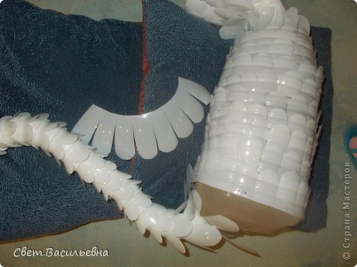 55. Прошу прощения за качество фото. Это перья для боковин хвоста. Главное, кажется видно, что они согнуты пополам и имеют по 4 отверстия. Не нарезайте их много, лучше добавить по месту. Использовать можно любую часть бутылки. У меня - конусная. Размер тоже на ваше усмотрение. Пришивать все перья будем по принципу: сзади - вперёд.