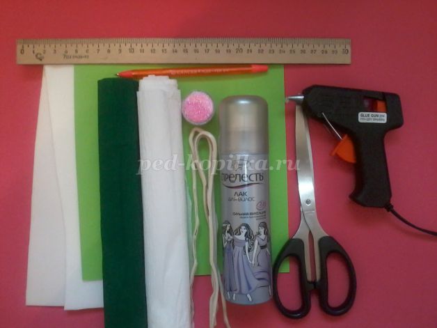 Этому чудесному цветку посвящено множество легенд. Одна из них гласит, что злой дракон решил похитить у людей Солнце; но схватив его, дракон сильно обжёг лапы. От злости дракон стал рвать и топтать огненный шар. Упавшие на Землю солнечные искры превратились в белые хризантемы. Цветок хризантемы как бы соединяет легкий холод зимы и теплое дыхание лета. Этот неприхотливый цветок поистине царского происхождения. Ведь когда-то на Востоке в его честь устраивали роскошные пиры, изображение хризантемы служило символом знатности, счастья и считалось священным. Ему посвящено много стихов, мифов и легенд. Сегодня у восточной красавицы поклонников не меньше, чем у признанных королев - розы и орхидеи. Насколько древняя история у этого цветка - точно не известно, но изображения хризантем археологи находили на осколках мраморных и гончарных изделий, в орнаментах древних сооружений, в узорах восточного фарфора и даже на древних монетах. Одни утверждают, что родина цветка - Япония, другие говорят, что Китай, третьи - что Восточная Азия. В Японии, на родине хризантемы, ее изображение входит в национальный герб, она является символом солнца. Орден хризантемы - высшая награда этой страны. Инструменты и материалы. Для работы понадобятся такие материалы и инструменты: картон для шаблонов, шариковая ручка, ножницы, горячий пистолет, лак для волос, косметический блеск, нитки капроновые №20, проволока, гофрированная бумага белая и зелёная.