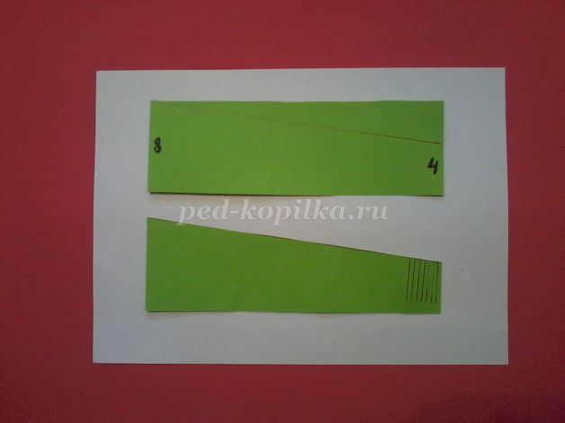 2. С одной короткой стороны прямоугольника откладываем 4 см и по линейке соединяем с углом противоположной стороны. Отрезаем лишнее. Получается вот такая деталь (схема в приложении).