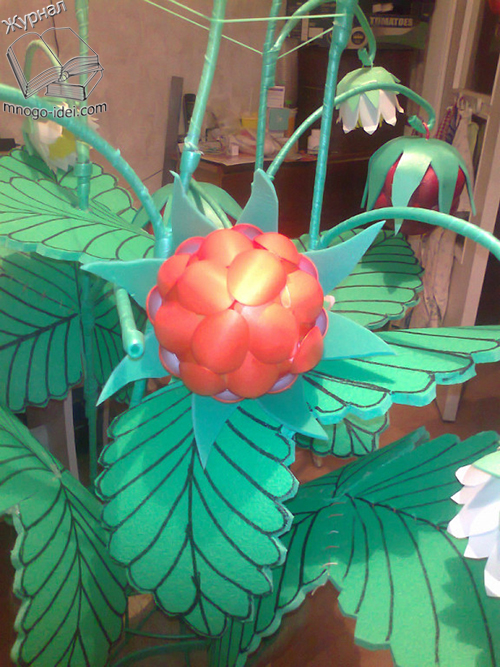 Когда всё готово, можно вешать ягодки и цветочки на веточки. Чашелистик к ягодкам и цветам также делаем из зелёного изолона. Цветы клубники можно сделать из баночки из под йогурта.