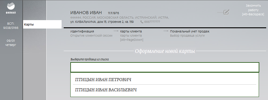 Рис. 15. Ввод ФИО продавца При наличии нескольких лиц с одинаковыми ФИО предлагается их перечень для последующего выбора.