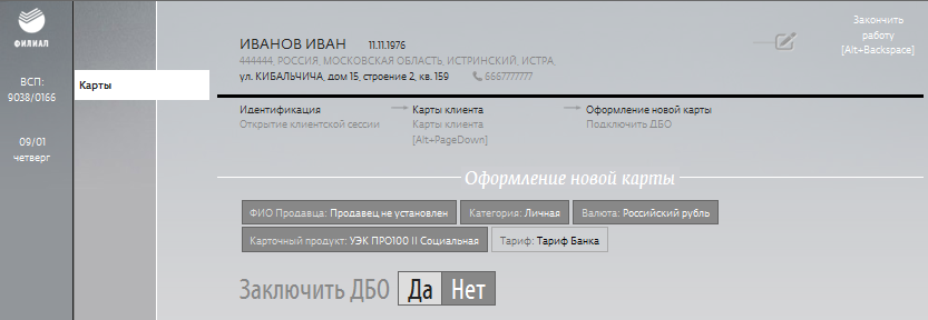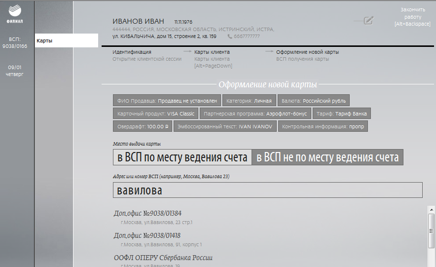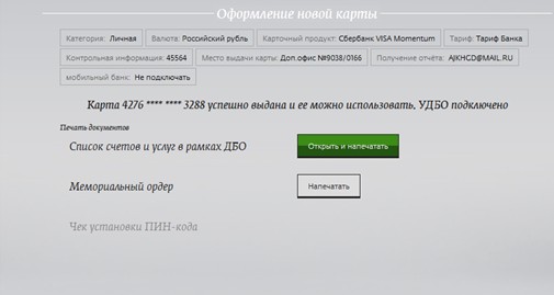 Рис. 37. Оформление карты При успешном выполнении операции можно вернуться к списку карт Клиента (кнопка Вернуться к списку операций).