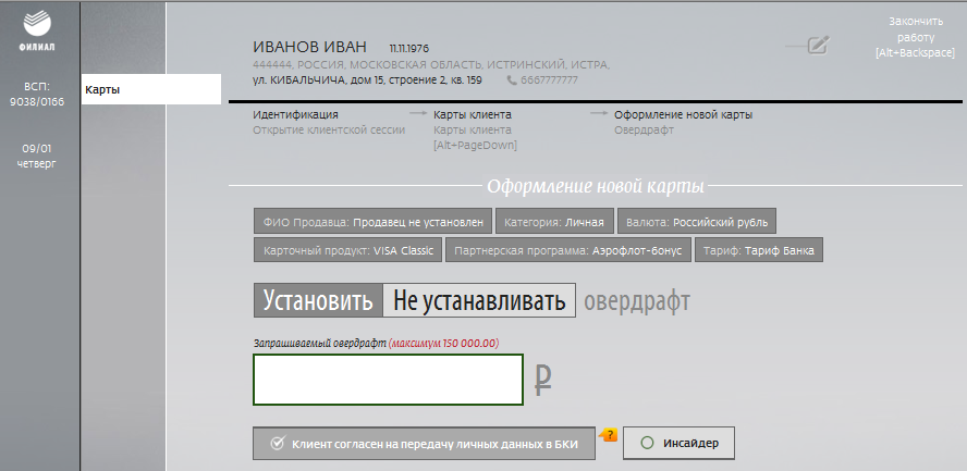 Рис. 27. Ввод суммы овердрафта Со слов Клиента проставляется отметка о его согласии на передачу данных в БКИ. Если у Клиента есть родственники, работающие в Сбербанке России, необходимо внести отметку в поле Инсайдер. Данные о родственниках вносятся непосредственно в распечатанное заявление на получение карты. Отметку можно проставить с помощью мыши или клавиши < пробел>. 10. Сверить с Клиентом эмбоссируемый на карту текст. Внимание! Длина текста (< имя > + пробел +< фамилия >) не должна превышать 19 символов. Эмбоссированный текст может содержать только латинские буквы и символы