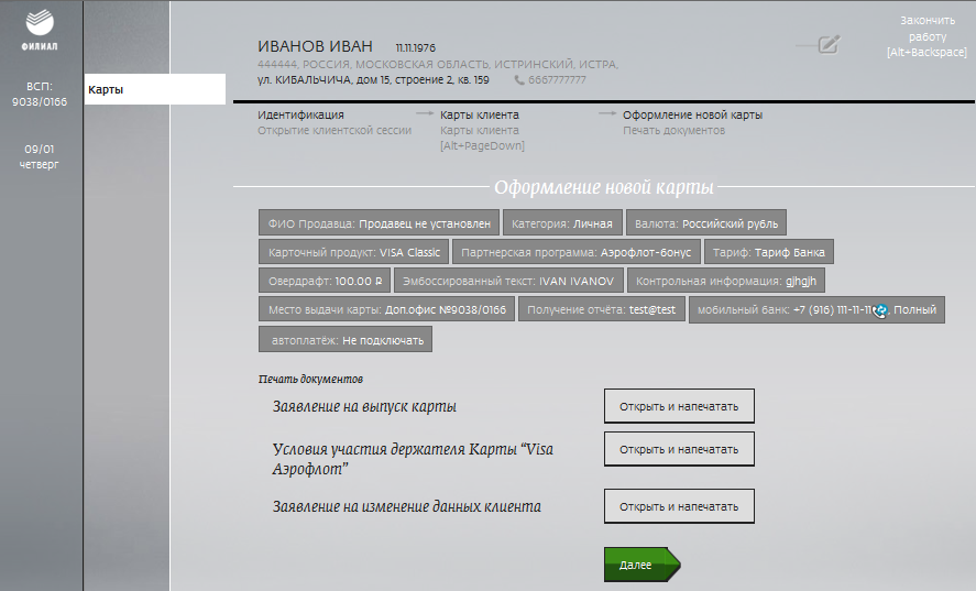 15. Распечатать необходимые документы для получения карты и отдать на подпись и проверку Клиенту. В случае обнаружения ошибок можно вернуться к нужному шагу (стадии выполнения).