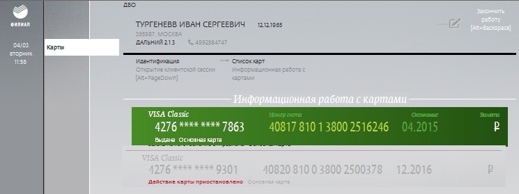 Рис. 70. Возврат к операции блокировки карты Если выбрана причина досрочного перевыпуска карты " Изменение имени, фамилии, подписи" предлагается ввести старые личные данные Клиента: фамилию, имя, отчество для отображения их в заявлении на перевыпуск. Введенные данные сравниваются с данными из карточки Клиента.