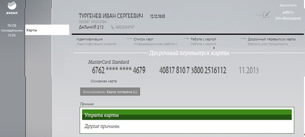 Рис. 67. Ввод причины потери карты · При блокировке карты кодом (S) " Укадена" доступны следующие причины досрочного перевыпуска карты: