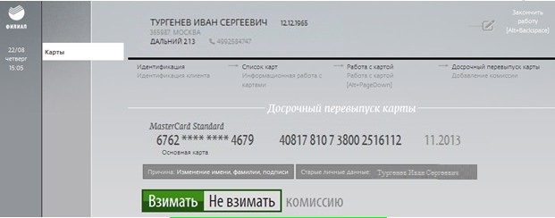 Рис. 74. Взимание комиссионного сбора 5. В случае отсутствия окна с выбором возможности взимания комиссии после указания причин досрочного перевыпуска и заполнения дополнительных сведений (при запросе АС) осуществляется переход к экранной форме выбора места выдачи карты.