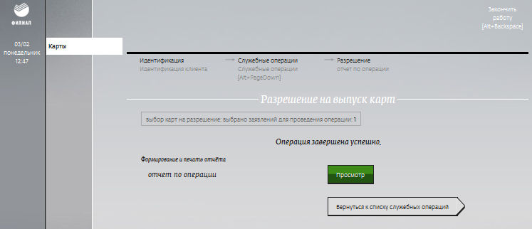 Рис. 210. Фрагмент отчета по операциям Сформированный отчет при необходимости можно распечатать. 6. Нажать на кнопку Вернуться к списку служебных операций после завершения операции. После успешного проставления разрешения заявление на выпуск карты будет отправлено в ГПЦ.