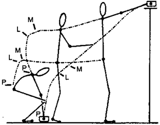 Примечание 25.2.1. Нарушенная координация двигательных программ у пациентов с синдромом Паркинсона Когда мы берем предмет с пола и ставим на полку, находящуюся в отдалении, мы должны перейти из согнутой позы в выпрямленную, сделать несколько шагов и поднять руку, чтобы положить этот предмет на полку. В этом движении сочетаются выпрямительное движение (P), горизонтальное продолжающееся движение (L) и поднятие руки (M) (рис. 25.2.1).